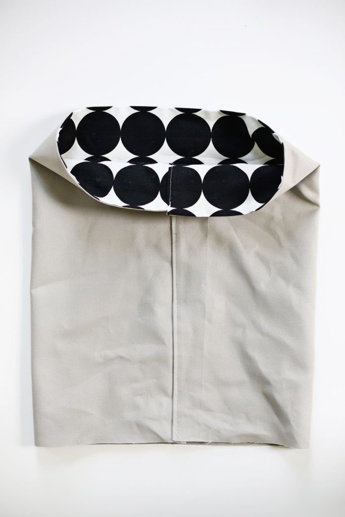 Bước 6: Dùng kim khâu hoặc máy may, khéo léo may các mép vải vừa cố định bằng ghim với nhau. Khi hoàn thành, bạn sẽ có một miếng vải hình trụ, khéo léo mở mặt trong vải hướng ra ngoài như dưới đây