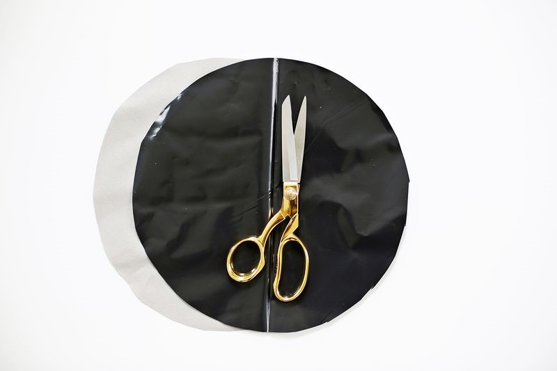 Bước 7: Bạn xếp chồng miếng lót bằng nhựa lên một miếng vải bên dưới, cắt một hình tròn đường kính 26cm hoặc theo kích thước phù hợp với cây của bạn. Đường kính thực sự của hình tròn bạn sử dụng là 24cm với mép vải khoảng 2cm sẽ được may dính vào miếng vải hình trụ sau đây.